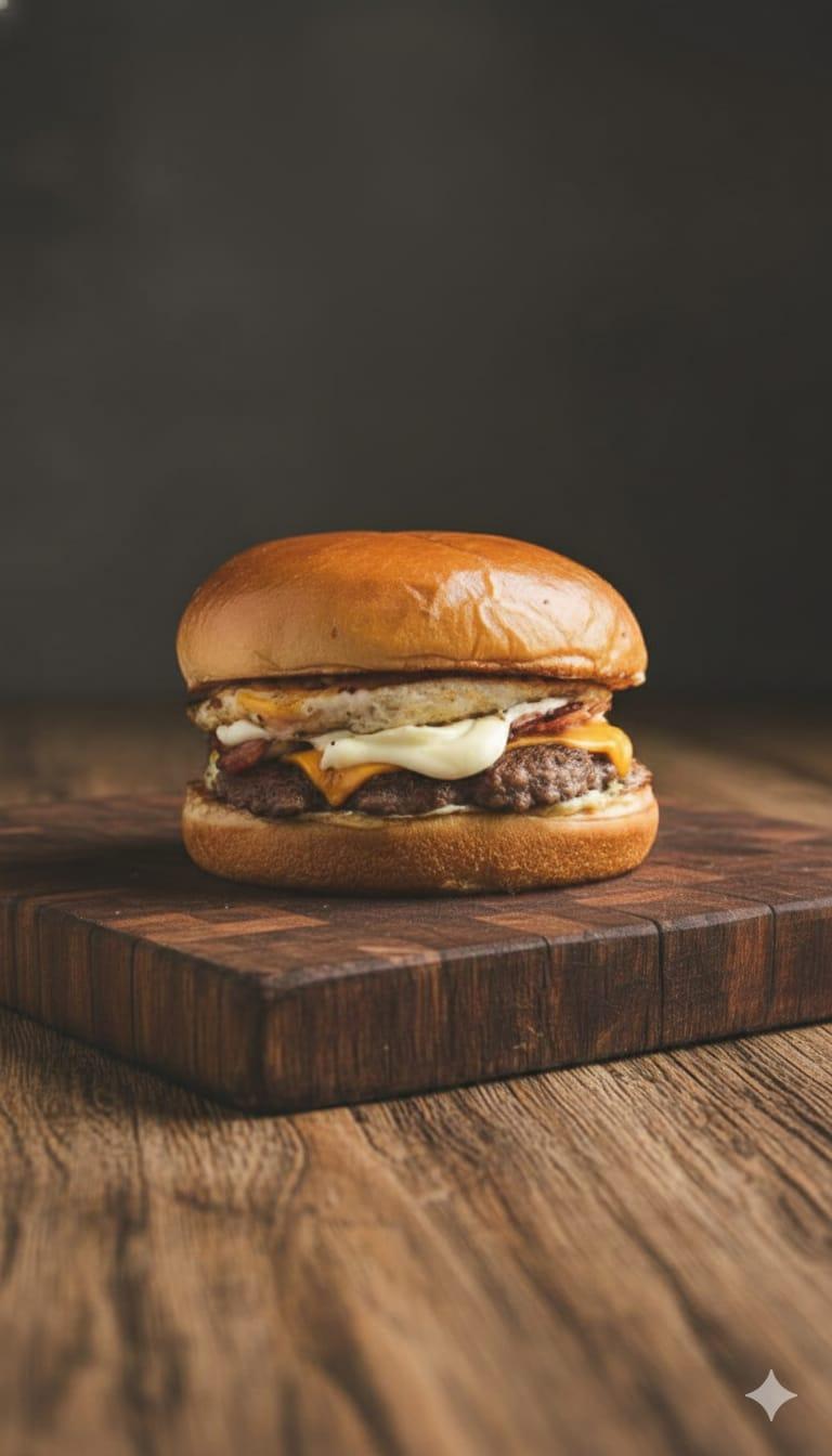 Pão de brioche ,blend 100g,queijo cheddar,bacon,cream cheese,ovo,maionese da casa.